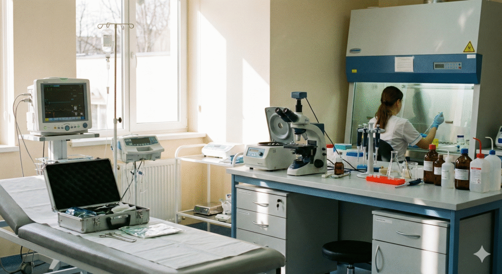 Memasang dan memastikan peralatan siap digunakan dengan benar dan aman oleh tenaga medis atau teknisi lab.